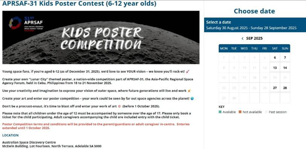 The Australian Space Agency organised six local poster competition events (see Figure 1) at the Australian Space Discovery Centre during in September 2025. These events were promoted on the Agency’s social media channels, outlining the ‘Lunar City’ theme and encouraging Australians to participate in the poster competition.