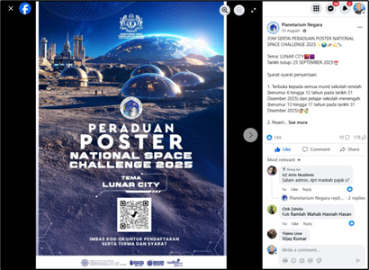 The Poster Contest is one of the activities under the National Space Challenge 2025 (NSC2025), organized annually by the National Planetarium, a division of the Ministry of Science, Technology and Innovation (MOSTI). Now in its 18th edition since its introduction in 2007, the 2025 contest adopts the theme “Lunar City,” following the poster contest initiative announced by the Asia-Pacific Regional Space Agency Forum (APRSAF) Space Education for All Working Group (SE4AWG). The contest is conducted online and consists of two categories: primary and secondary school. Students create their posters at school and submit them through the online form provided by the organizer. The contest offers students the opportunity to imagine, enhance their creativity, and express their ideas through art.